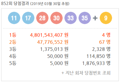 | 로또 853회 당첨결과 1등 7게임 배출! (1등 당첨금 약 28억) (0) | 2019.04.07 |