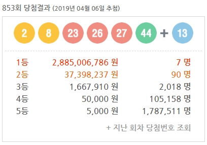로또 853회 1등 당첨번호 6개는 2, 8, 23, 26, 27, 44이고, 2등 보너스 번호는 13번 입니다.